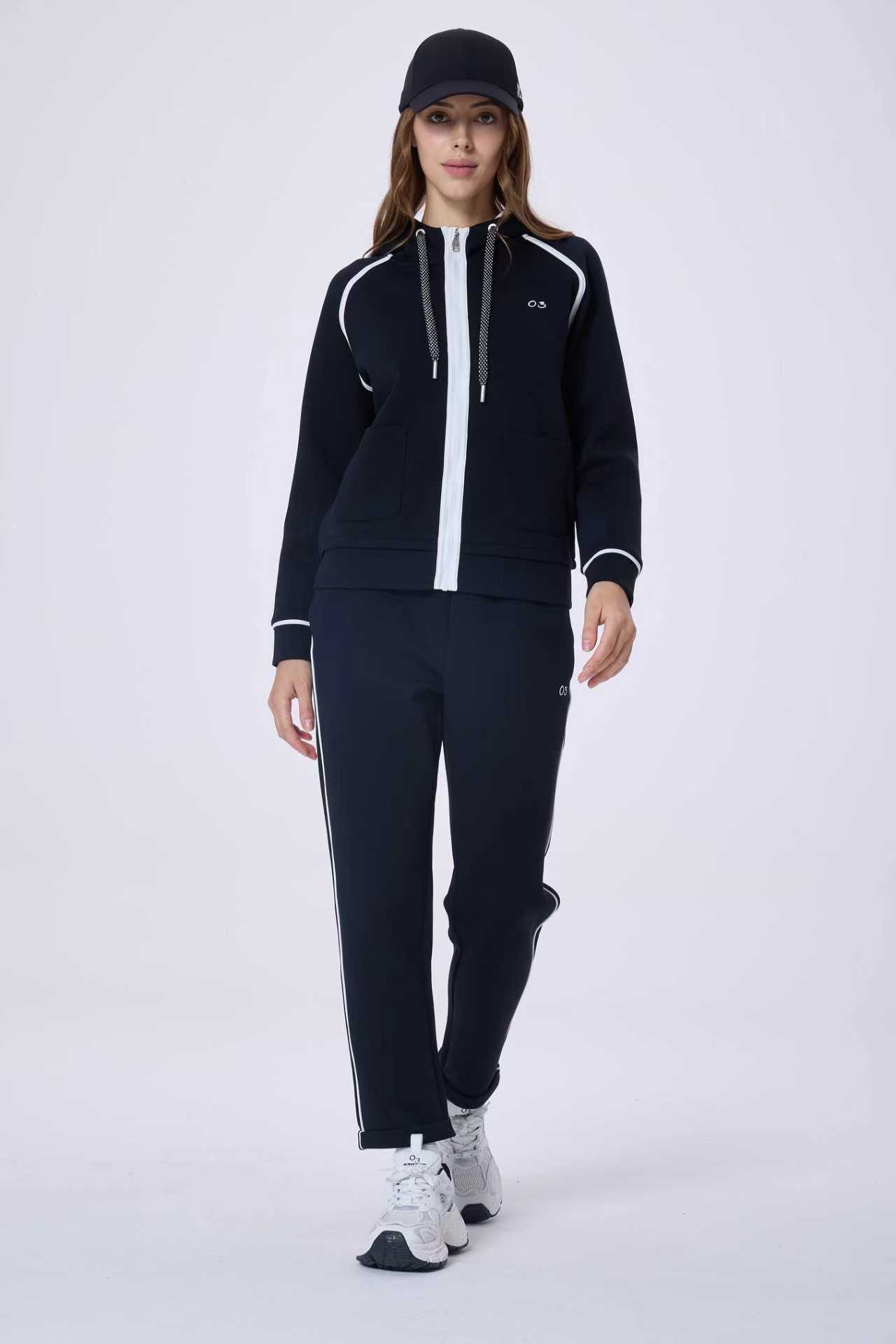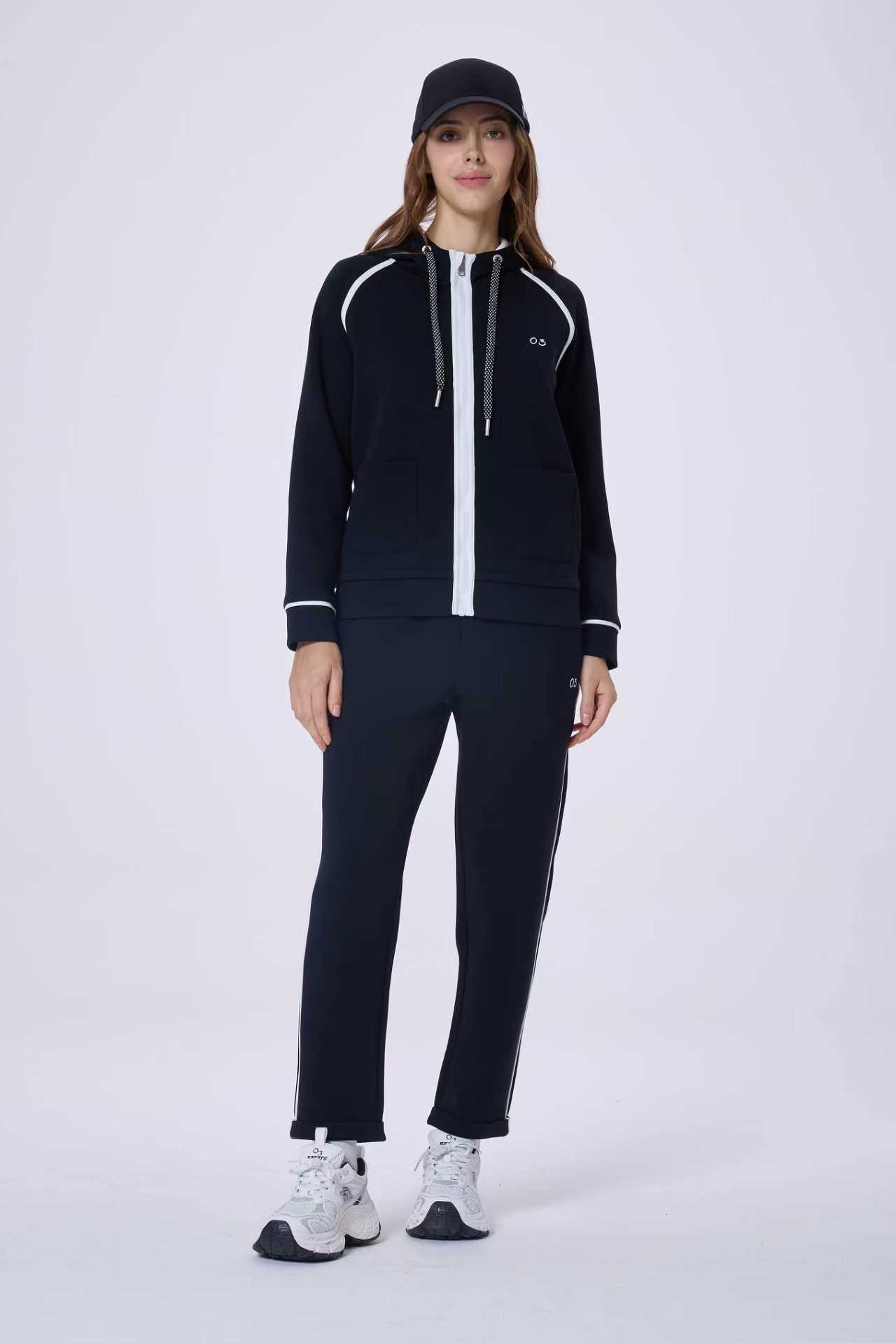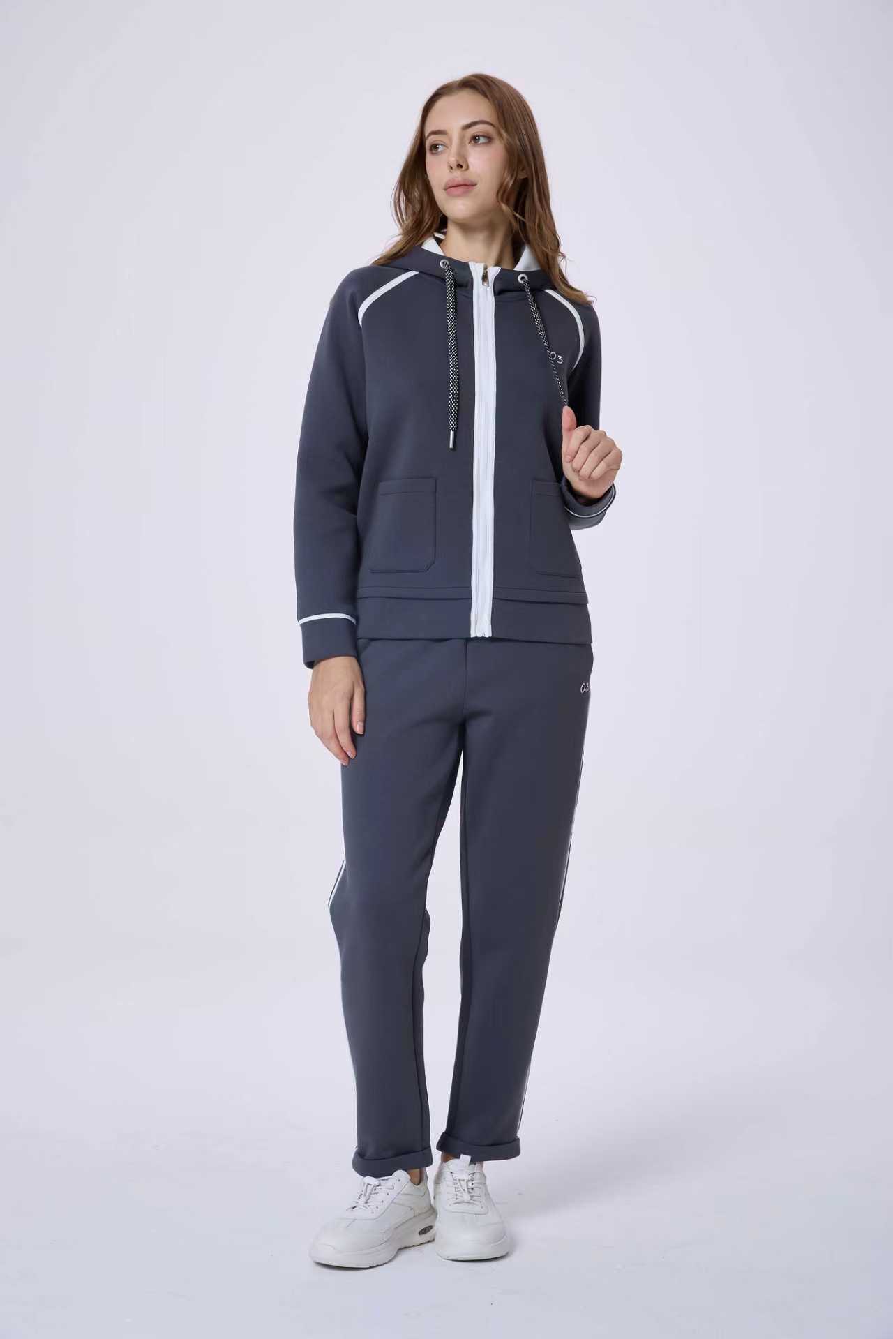 Designed for daily comfort with a clean athletic finish, this women’s tracksuit set is made from premium cotton fabric that feels soft and smooth on the skin. The hooded jacket features a full front zipper, adjustable drawstrings, and practical front pockets, highlighted with contrast piping details that add a modern sporty touch.