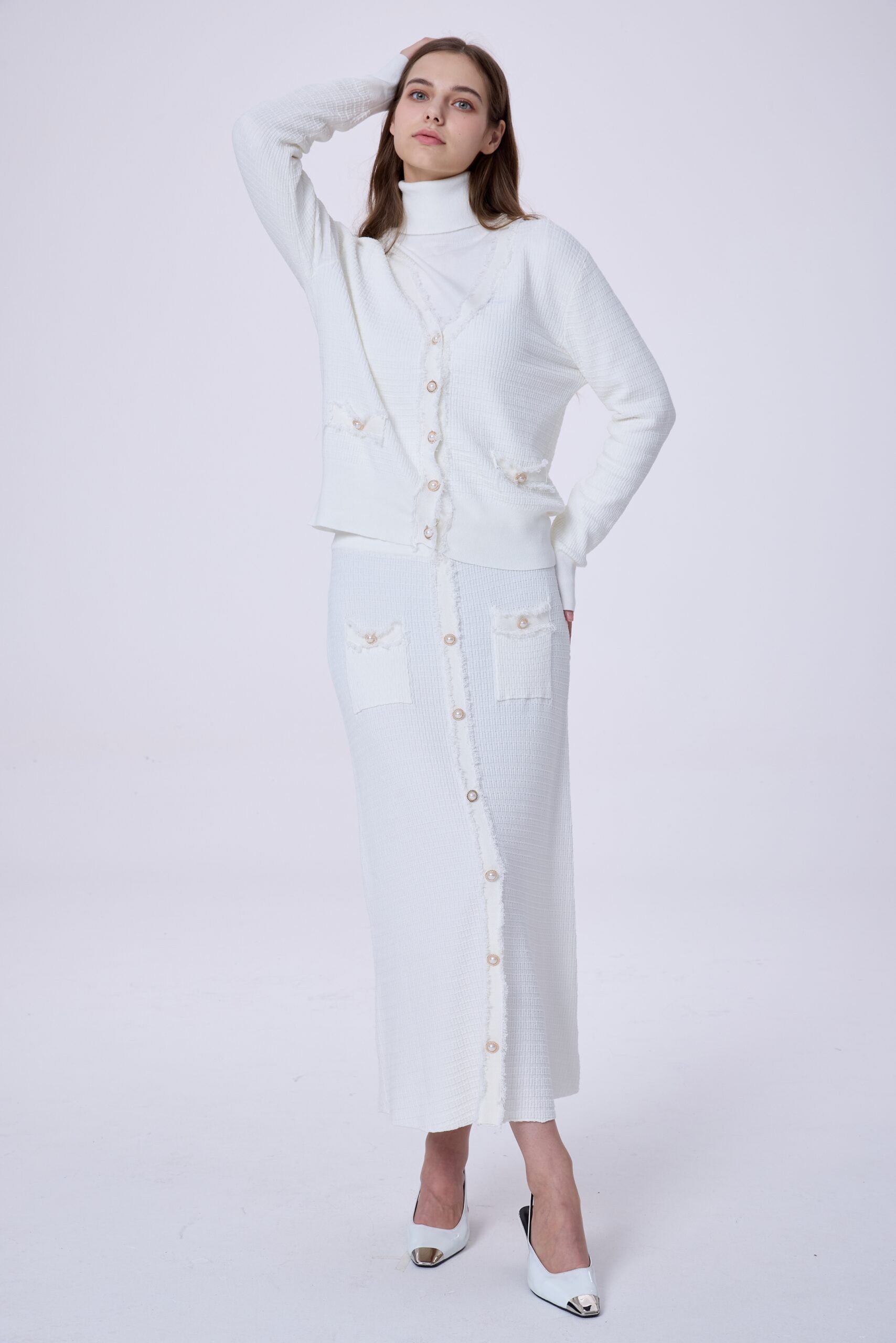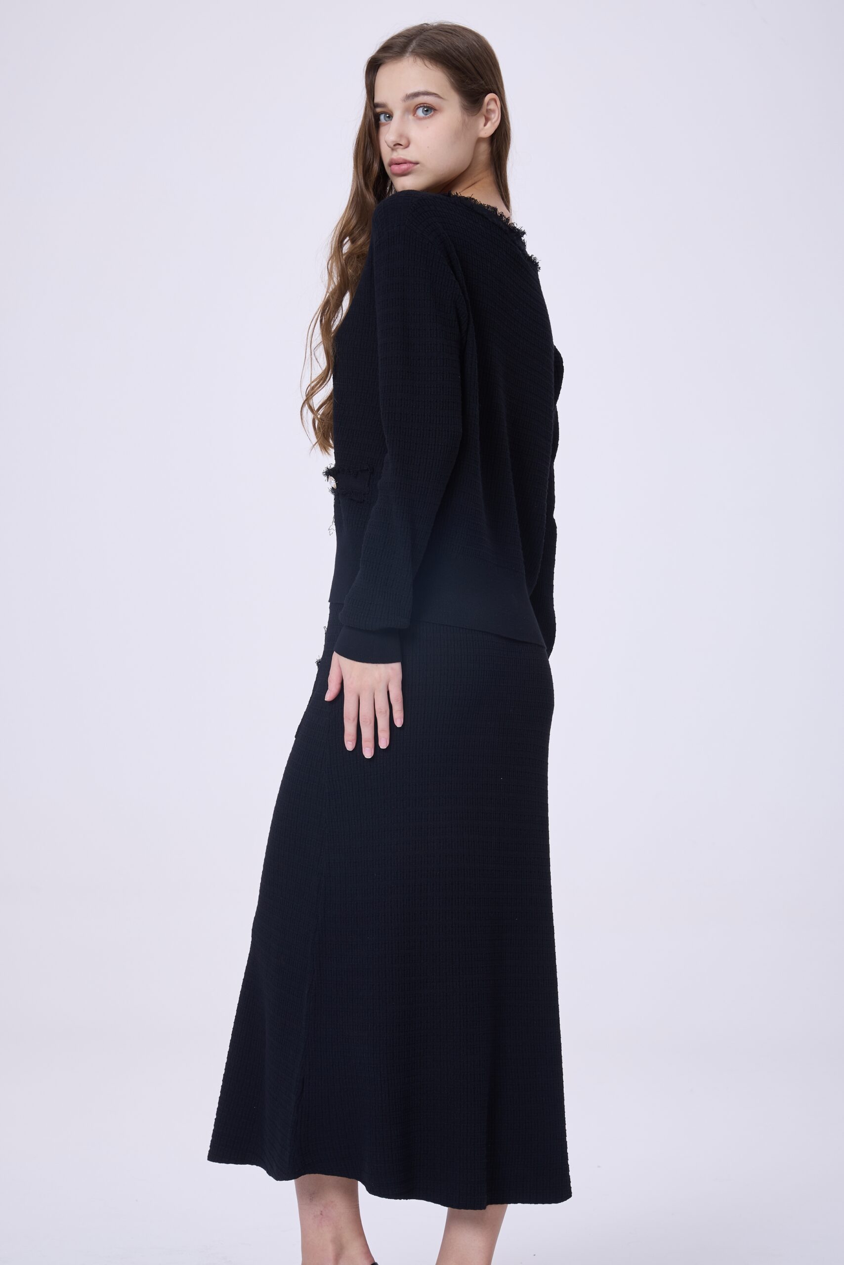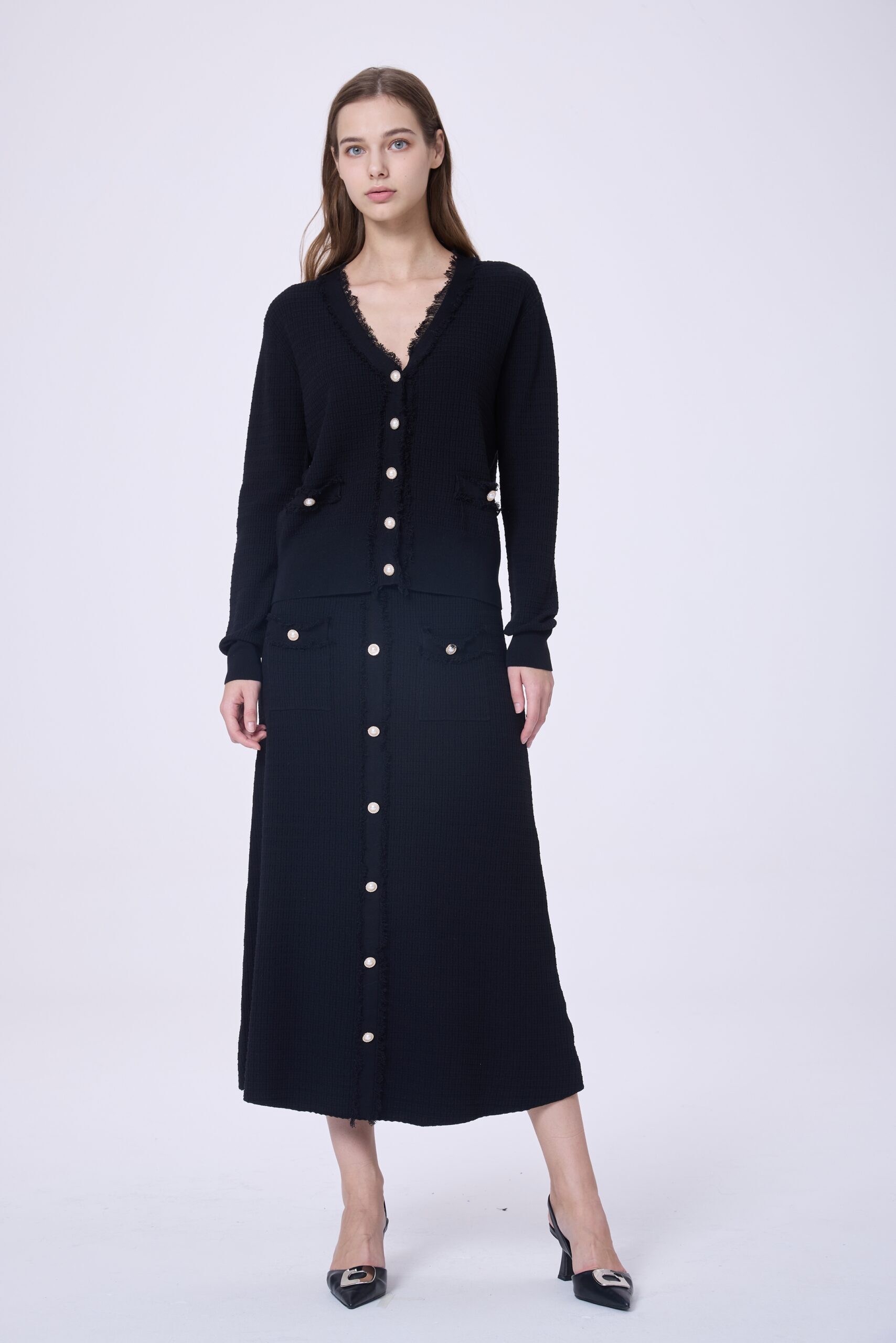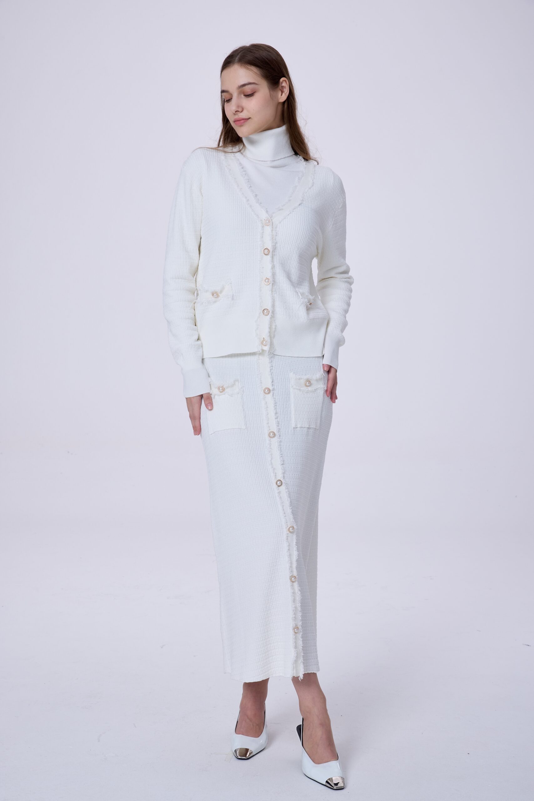 This women’s two-piece set includes a jacket and skirt made from a premium winter-feel fabric that offers a refined texture and comfortable wear. The jacket features a button-front design that creates a clean, elegant line, while the matching skirt completes a balanced, feminine look. Easy to style for daily wear or smart occasions, this set is an ideal choice for women who prefer classic elegance with a modern touch during cooler days.